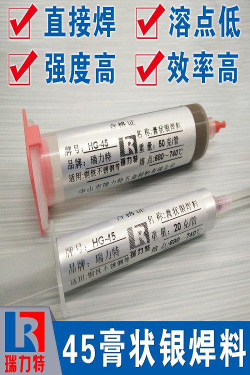 膏状银焊料,膏状银钎焊料,银焊膏、银钎焊膏、钎焊膏公司牌号是:HG-45。是一种由超细银合金粉末、助焊剂、粘结剂组成的膏状银钎焊料。固液相线:665~745℃,建议最低钎焊温度:760℃。是银铜锌系列的产品,适用于复杂焊点、精细焊点、密集焊点等各种黑色金属及除铝镁外金属工件的钎焊,采用火焰钎焊,高频钎焊,电阻钎焊,炉中钎焊等都行,焊接时无需添加助焊剂,但焊前需对工件进行除油除锈处理。广泛运用于精密仪器、大功率发电机,水轮机,航空发动机等产品。配合自动点膏机、自动钎焊机,可以实现高效率规模化生产。钎焊是个系统工程,因涉及到钎料的匹配性,请亲们下单前先通过旺旺咨询我们店主,以便为您遴选更适用和经济性的产品。