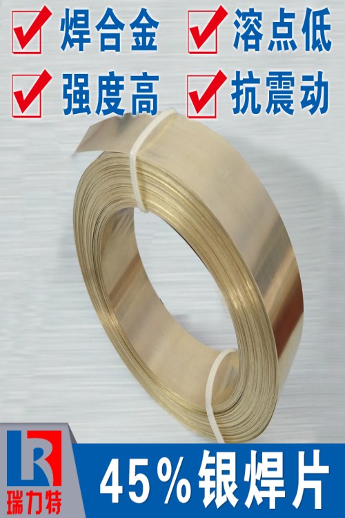 焊不锈钢用45%银焊片,焊铜/铜合金用45%银焊片,焊合金刀具用45%银焊片的公司牌号是:BAg45C,国标牌号是:BAg45CuZnCd,美标牌号是:BAg-1。是一种含45%银、15%锌、24%镉16%铜的银基非环保钎焊材料,固液相线:605~620℃,建议最低钎焊温度:640℃。是银铜锌镉系列综合性能最好的产品,铺展性、流动性、填充性极好。适用于有较高表面光洁度、强度及气密性要求的铁或钢件、不锈钢、硬质合金、铜或铜合金的钎焊,采用火焰钎焊,高频钎焊、电阻钎焊都行,焊接时需添加助焊剂,如银焊粉,银焊膏等,且焊前需对工件进行除油除锈处理,因含有镉,焊接时注意保持良好通风。广泛运用于各种黑色金属、除铝/镁外的各有色金属及合金工件的钎焊,特殊适用于硬质合金刀具钎焊,钎焊面积大的工件。因其温度低,特别适合有较低温度要求及多级钎焊中的末级钎焊。性能优于BAg40C。宝贝常规规格有:0.1*40 0.15*40ER 0.2*40ER,圈装带材,宽度可订制裁切。