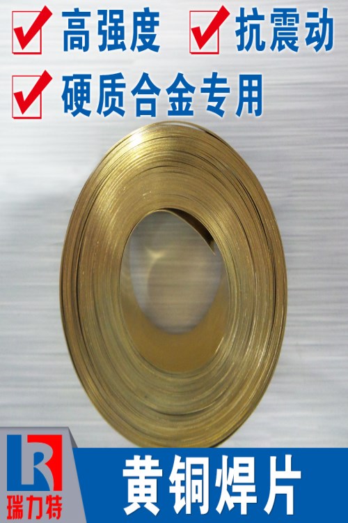 焊硬质合金用铜焊片,焊钻头用铜焊片,焊车刀用铜焊片/黄铜焊片的牌号是:BCu60ZnSn,HL105。是一种含58%铜、38%锌、1%锡、1%锰的铜基钎焊材料,固液相线:790~850℃,建议最低钎焊温度:860℃。适用于有较高强度要求的硬质合金、合金的钎焊,采用火焰钎焊,高频钎焊、都行,焊接时需添加助焊剂,如铜焊粉、硼砂等,且焊前需对工件进行除油除锈处理,焊接时注意保持良好通风。广泛运用于各种硬质合金刀具,车刀,钻具,矿山钎具的钎焊。圈装带材,宽度可订制裁切。