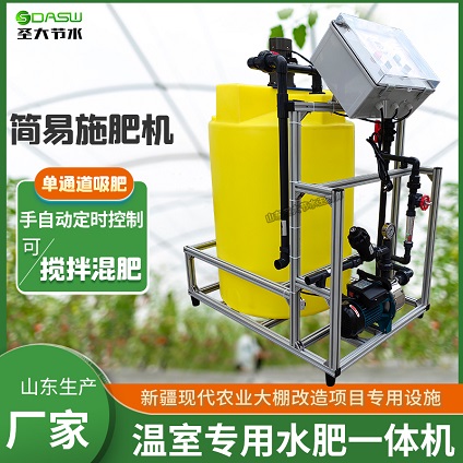 圣大节水,针对新疆现代农业温室基地改造生产的这款简易水肥一体机型,可手自动定时控制,单吸肥通道160L/h, 上肥量通过流量阀门,手动可调; 手动施肥机进出水管口径为:DN25;施肥机自带小型过滤器(过滤肥料)、自带一个混肥桶和搅拌电机;手动旋钮定时开关,简单好操作。