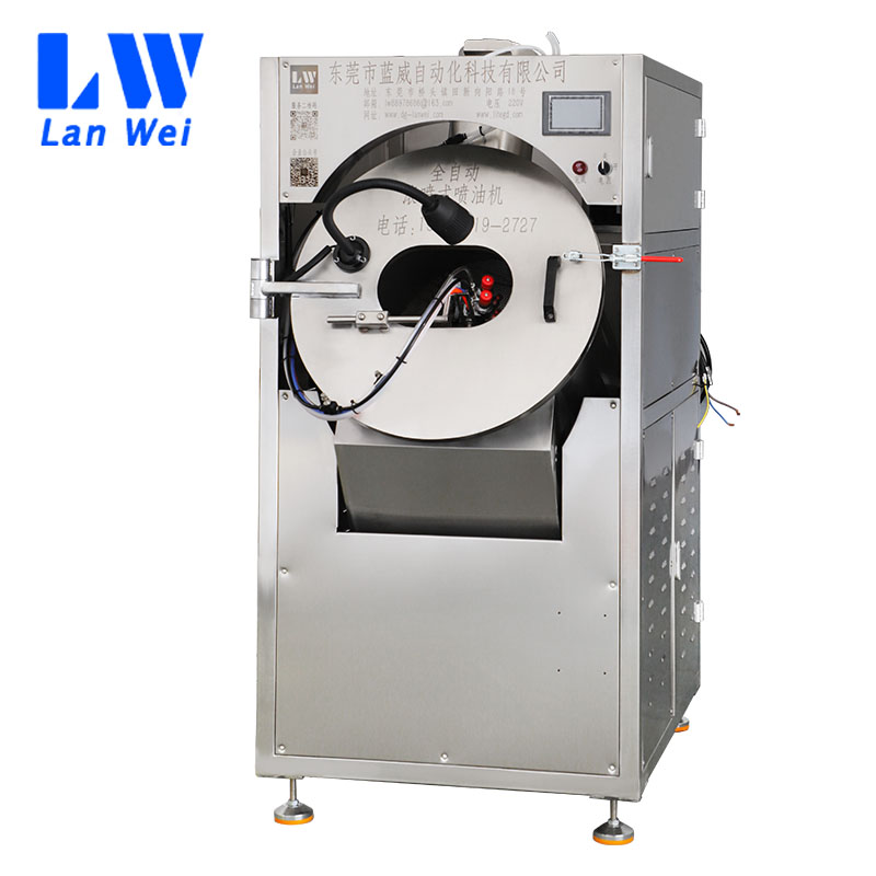 滚筒式自动喷油机内设自动烘干功能,喷涂均匀、快速,根据产品的性质特点可自由调节温度高低,能喷高光产品,省油300%以上,效率提升5倍以上,一人可同时操作7-8台机器,结构新颖,体积小方便摆放,操作简单易学。自动滚喷漆机具有工作效率,材料选用好钢材,内有不锈钢滚筒,滚筒是自动喷涂设备中的易损件,材质直接影响使用寿命。滚筒易清洗又省时间它的设计也很新颖,滚喷机全封闭式的作业,操作起来简单方便,一人能看三台机器。自动滚喷漆机不仅提升了产品的质量、还能提高生产效率,加大油漆利用率节省油漆,从而降低成本,同时配合我公司的净化设备,能营造工作环境,保障了操作人员的健康,废气废漆通过净化之后,也不会对环境产生污染,因此它具备了节能和环保等多种大功能。
