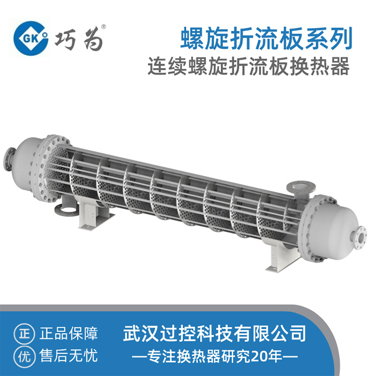 连续螺旋折流板换热器是一种新型的管壳式换热器,将弓形折流板替换成螺旋状或近似螺旋状的折流板,它突破了弓形折流板换热器壳程流体做“Z”字形折返流动方式的难题,使壳程流体沿螺旋通道自壳程进口向出口呈螺旋状推进。具有较好的传热与流体阻力性能,与弓形折流板相比综合性能提升明显。
