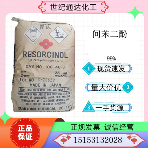 3.用作环氧树脂固化的促进剂及合成树脂、胶黏剂、染料、医药(对氨基水杨酸)的紫外线吸收剂。还用于合成间苯二酚树脂胶黏剂。间苯二酚是一种重要的有机化工产品和合成中间体,在轮胎、胶管及胶带中,使用间苯二酚树(RF树脂)浸渍人造丝及纤维帘子线,可增加帘子线与橡胶之间的粘接作用。用间苯二酚处理钢丝帘子线,可改善钢丝对橡胶的粘接性能。在橡胶胶料中加入间苯二酚可改进短纤维在橡胶母体中的增强作用。以间苯二酚为原料合成的双间苯二酚酯是一种非卤阻燃剂,具有较高的热稳定性,适用于改性聚醚、聚碳酸酯、ABS树脂以及各种热塑性树脂等塑料。间苯二酚还具有一定的杀菌作用。