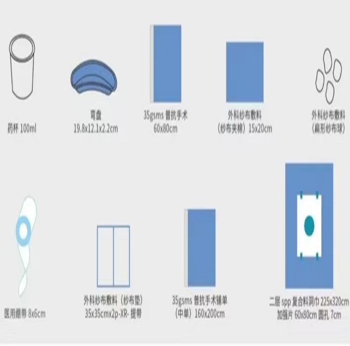 【结构及组成】:基本配置:手术单。选配产品:纱布垫、弯盘、药杯、纱布球、医用绷带、手术巾、中单、袜套、洞巾、包布。