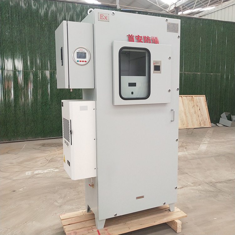 一般在进行设计时通风和补偿是实现机柜正压防爆的两种方法,两者终目的都是使机柜外壳内保持正压,从防爆机理上讲,很好的解决了机柜的电气防爆问题。但是由于通风式正压防爆结构的耗气量时补偿式的几十倍甚至是几百倍。在存在有发热元器件或大功率发热部件需要散热的机柜,可以采用通风式正压防爆结构会更加的合适,主要原因是通风式正压防爆结构的保护气连续不断通过正压外壳,把正压外壳内发热元件器的热量带走,有效解决了机柜的散热技术,极大提高了正压防爆柜的工作寿命与可靠性。