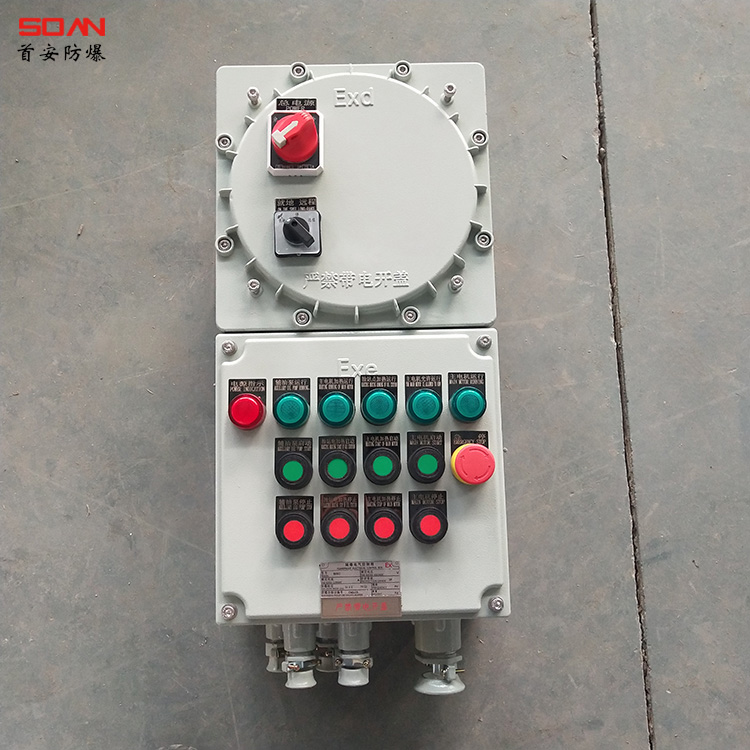 4.内部产品选择:在更换内部产品时,应选择质量有保证的产品,避免使用低价且没有质量保证的低阻产品,以免造成损耗加大和温度过高的情况。 5.导线进线口和出线口的设置:注意防爆配电箱的导线进线口和出线口的设置,尽量不要设在箱体的上顶面、侧面、后面或箱门处,尽量设置在箱体下底面。进线和出线应加护套并分路成束,导线束不能和箱体的进出口有直接的接触。 6.设备安装位置:设备的安装位置应设置在通风、干燥以及常温场所,设备周围应保留足够的工作空间和通道,不能堆放杂物,并且需要保证设备不受撞击、振动、液体侵溅以及热源烘烤等。 7.设备外壳和涂层:设备的外壳应采用铁板、铝壳、不锈钢板等绝缘材料制作,铝板的厚度应达到标准要求。设备的涂层应牢固均匀,没有皱纹、剥落、斑点、漏喷等不良现象,其表面要保持平整干净、没有凹坑或划痕等。