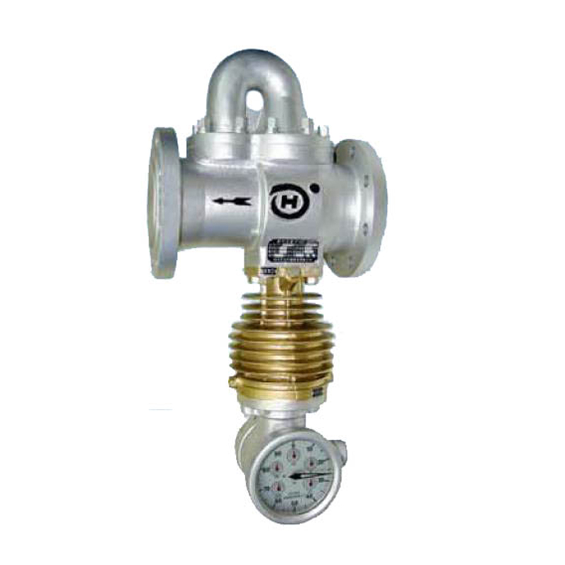 流量计由本体、指示器两部分组成。蒸汽流经该表,因孔板的阻隔,部分蒸汽按照一,定的分流比经喷嘴进入分流管。蒸汽从喷嘴喷出。对转子形成一个转矩。使转子轴旋转。在转子轴下部有一阻尼室,里面充满阻尼液(水或防冻液),其腔内有一阻尼叶片连接在转子轴上。由于阻尼作用,转子的转速比蒸汽的喷速慢得多,因转子能够有,效地吸取蒸汽喷射的动能,使它的旋转速度与蒸汽喷射形成的转矩及阻尼力矩相对应,并形成一确定的量的关系,即转子转速近似于线性的正比于流经该流量计的蒸汽流量。转子轴的转动通过减速齿轮组降低到适当速度,再通过磁性联轴器最后传至指示器的长、短指针,依据表盘指示直接读出蒸汽流量的数值。