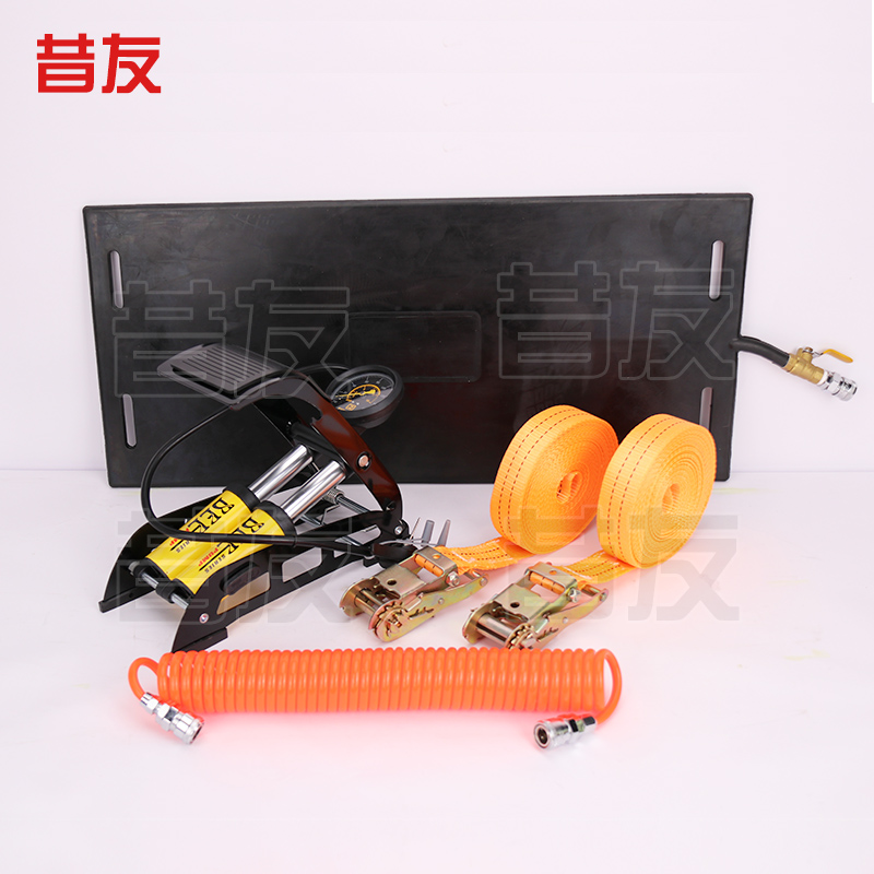 3,将堵漏袋绕管道或细罐体一圈或数圈,与导向扣接好,然后再把另一根带子对称绕堵漏袋与导向扣接好,再用导向扣把两根带子匀力收紧,拿操纵仪充气软管与堵漏袋接好;