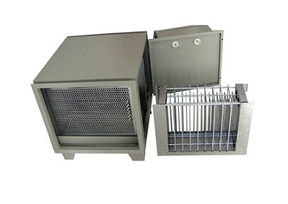 在引风机的作用下、油烟气混合污染物进入初级净化整流腔,腔内的特殊结构对污染物进行均衡整流的同时,利用亲油性的滤料对大颗粒油雾滴进行吸附截留,分离出来的油水液体被集中回收。脱除油水的烟气均衡地进入次级栅状高压场。油烟气在高压场的作用下,被电离、分解,吸咐 、碳化,同时场中产生的活性因子臭氧(O3),对烟气中的有毒成份和异味进行分解和除味。