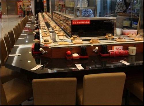 该设备启动后,输送带会自动回转,厨师将制作好的食品用碟子装好放置在输送带上面,食品就会随输送带循环回转,送到在座的每一位客人面前,供客人随意选择食用。并随时给予补充食品,