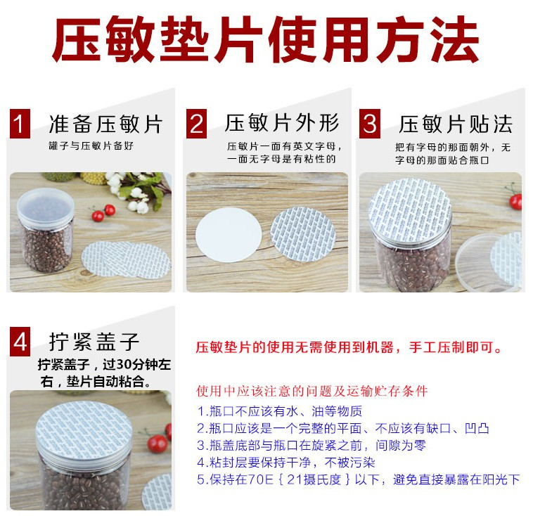 使用方法:把压敏垫片放入瓶盖底部(印字的一面向着瓶盖底部),然后拧紧瓶盖,经过30分钟左右,取下瓶盖,垫片已紧密地粘贴在瓶口上,达到了密封的目的。