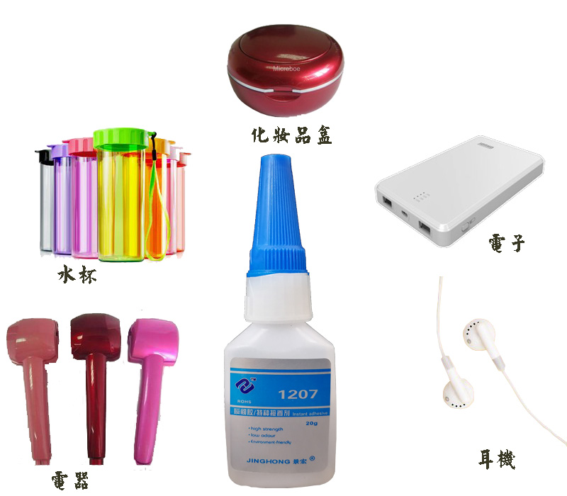 H 1207 无白化瞬干胶水广泛应用于(PP PE/硅橡胶需配合1205处理剂处理粘接面后涂胶水贴合),矽胶,橡胶,三元乙丙橡胶;NBR橡胶;天然橡胶;丁晴橡等;塑料之间粘接如(PP,ABS、PVC、PS、PC、PU、TPR/PMMA、HIPS、PA、EVA、PET、PBT等塑料;金属如铁、不锈钢、铝合金、磁铁、锌合金、铜、电镀五金制品等。