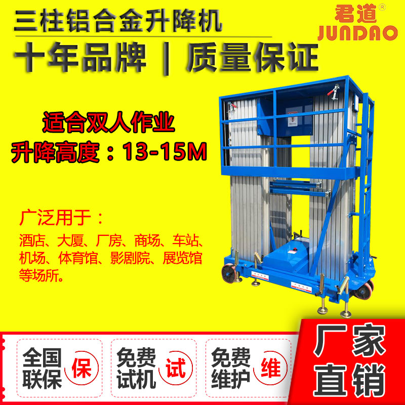 性能特点:双人加强型三柱式铝合金升降机,工作高度可达15.7米,配有地面、平台两套操作按钮及围栏自动升降系统,方便使用操作,电动液压升降,升降柱采用双链条式高强度铝合金型材,安全可靠升降平稳,无噪音液压单元经久耐用,设备移动方便灵活。