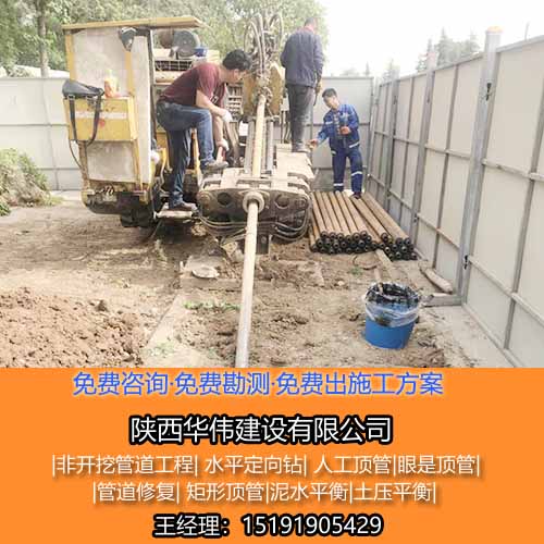 市政管道顶管施工多少钱一米 西安非开挖顶管施工每米价格 咨询电话15191905429,电话029-68541977,QQ号码:2198176122,网址:http://www.hwjs.cn/。,陕西华伟建设有限公司,主要从事石油、天然气、电力、电信、国防通讯等非开挖工程施工。陕西华伟建设有限公司专业从事非开挖顶管工程,地下管道铺设,具有多年的非开挖工程顶管施工经验,拥有大型公司生产的顶管、非开挖水平定向钻机,施工咨询热线。陕西华伟建设有限公司,承接PE管、水泥管、钢管等各种口径的管道顶管工程。天然气、自来水、污水、雨水、 电力、石油管道,以及公路、铁路、水利、给排水等顶管工程。经营范围包括水平定向钻、泥水平衡、人工掏管、管道修复等专业的非开挖工程。公司是以非开挖地下管线铺设为主业,从事各种管道铺设、维护的企业。拥有自己的施工队伍,可为客户提供全方位的优质服务。业务服务区域:陕西及西北五省等区域。