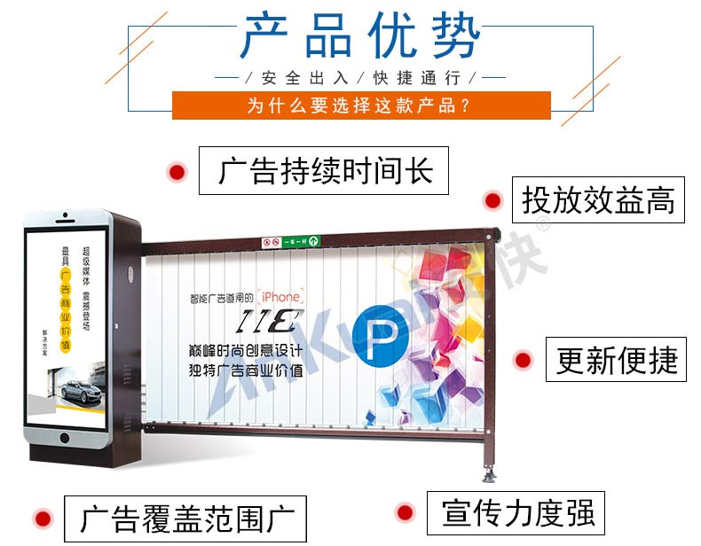 ND-501产品介绍:纽达ND-501广告道闸,IPHONE小苹果外观,巅峰时尚创意设计,独特广告商业价值,颠覆传统,实用与商业的完美融合,是我公司经过精心设计并制作的一款能够适应现代“安全、快捷、高效、高质”管理的新一代的数字媒体道闸。目前,媒体的传播力与媒体的生活属性息息相关,越贴近生活者,越造福生活者,就越易受关注,道闸媒体正是我们为车主、社区百姓与广告主架设的信息桥梁。其高标准、高质量、高集成化的特性,时尚潮流的外观形象,及其独特地颜色视觉魅力,也给人一种尊贵高雅、爽心悦目的感觉,使得与其搭配起来更加具有相得益彰的效果,是停车场,酒店,学校,花园别墅小区,企事业单位等场合的配套首选。
