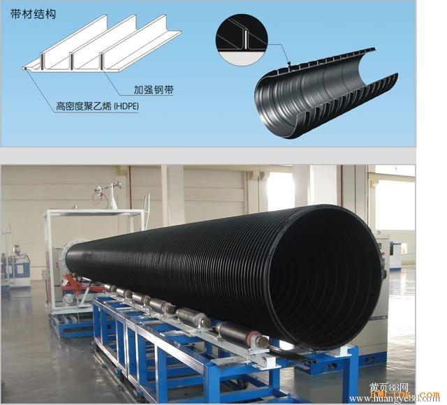 焊接(搭接面上挤出焊接)制成,其内壁光滑平整,规格为DN200- DN3000mm。该种管材具有耐腐蚀、质量轻、安装简便、通流量大、寿命长(50年)等优点,可替代高能耗材质(水泥、铸铁、陶瓷等)制作的管材,属环保型绿色产品。1、安全可靠的环刚度与纯塑管相比,增强的钢带极易使管材特别是大口径管材具有足够安全可靠的环钢度。